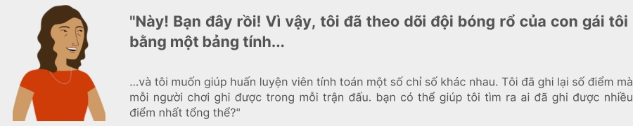 Trước khi viết công thức, hãy nghĩ về vấn đề mà chúng ta đang cố gắng giải quyết. Bạn của chúng tôi muốn tìm hiểu người chơi nào ghi được nhiều điểm nhất trong năm trò chơi này.