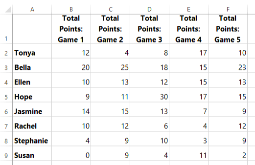 Khi bạn đã tải xuống bảng tính của chúng tôi, hãy mở tệp trong Excel hoặc ứng dụng bảng tính khác. Bạn có thể muốn dành một chút thời gian để xem dữ liệu được tổ chức như thế nào. Như bạn có thể thấy, có một hàng khác nhau cho mỗi người chơi và các cột khác nhau cho số điểm họ ghi được trong mỗi trò chơi.